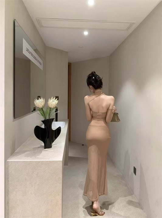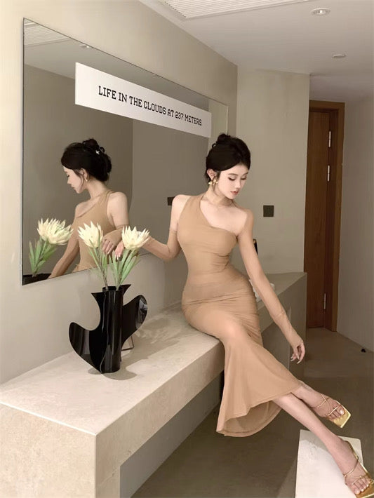 Thisasymetric nude maxi dress featuring a double fabric. The arms are removable to create multiple looks! It fit comfortable and stretchy. It'S perfect for party dinner or a speacial occasion.